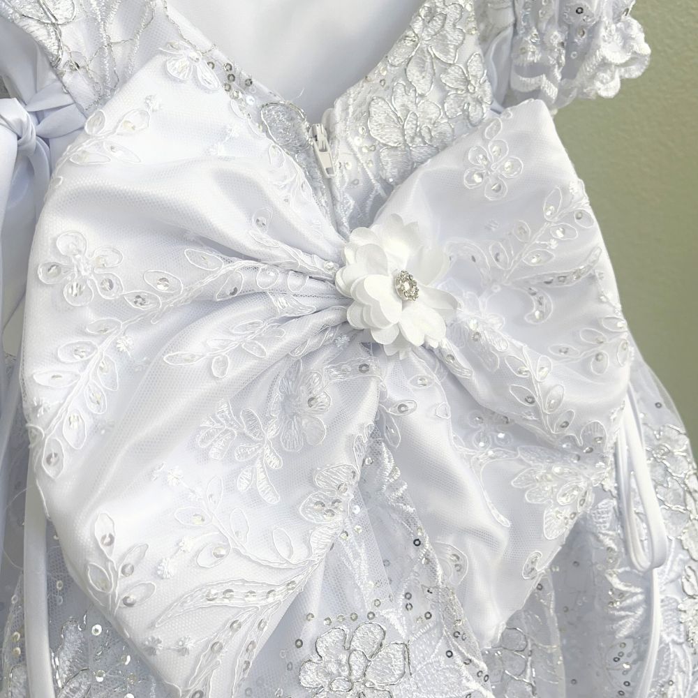 The gown features soft bridal satin layered with delicate floral lace, creating a gentle, flowing silhouette that captures each joyful moment. Adding an extra touch of sweetness is the sheer organza cape and a dainty matching bow headband — perfect for framing her radiant little face. Shimmering rhinestone embellishments highlight the elegance of the crisp white fabric, bonus big bow at center back, making this dress a timeless heirloom treasure for her baptism or christening celebration. Adjust sides of the blouse corsets for a custom fit.