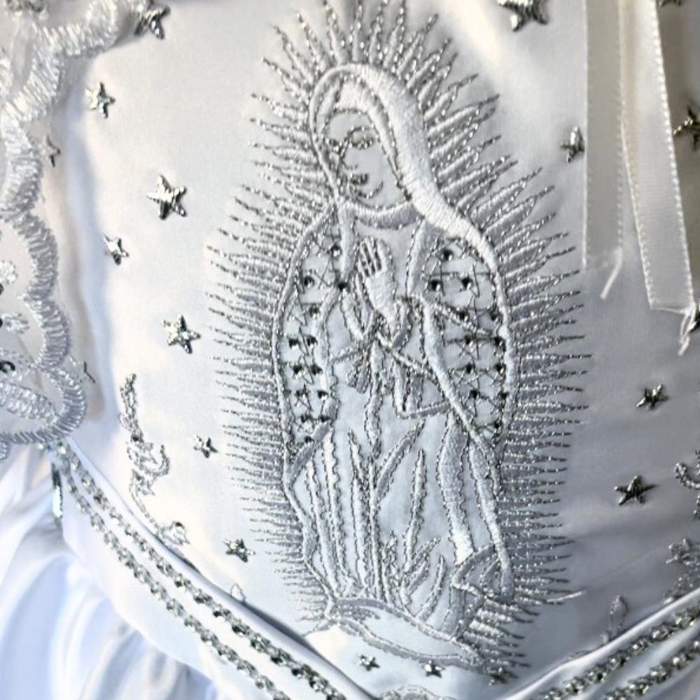 Dress your little girl in beauty and blessing with this elegant christening gown — lovingly designed to honor her sacred day with grace and charm. Your baby girl will look absolutely precious in this puff sleeves baptism dress with ruffles, tenderly adorned with an embroidered image of the Virgin Mary, symbolizing faith and protection.