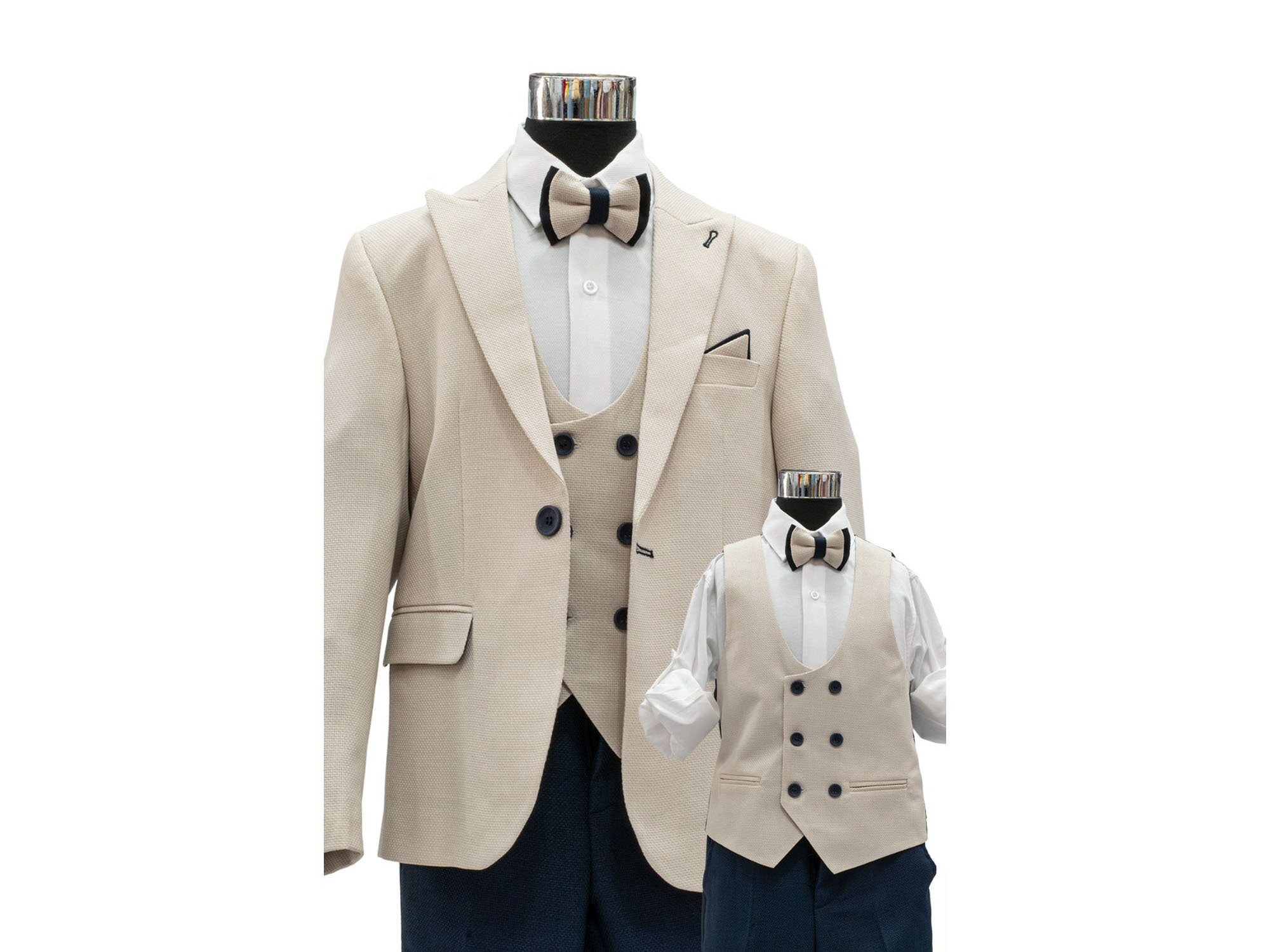 Introducing our Slim Fit Tweed Suit, the epitome of style and sophistication for young gentlemen. Crafted with the finest attention to detail, this suit is designed to make a statement at any special occasion. Available in two timeless colors - classic light blue and elegant beige - paired with dark pants for a polished look.