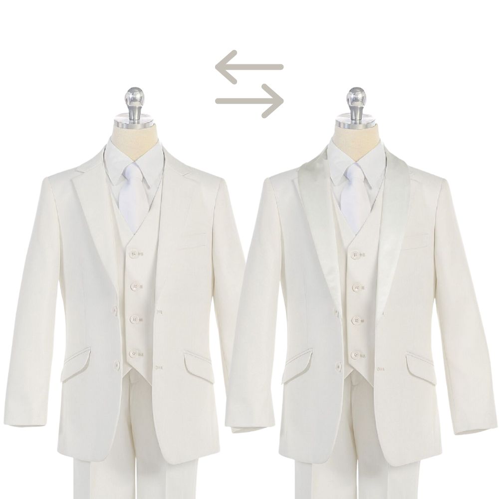 Boys Ivory classic suit with removable lapel. 6 piece set: coat, vest, pants, shirt, tie and removable lapel
