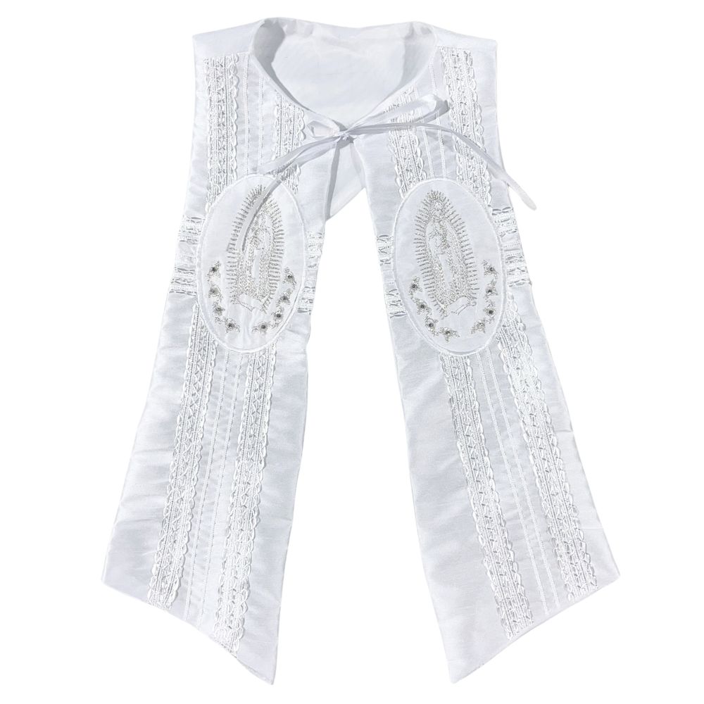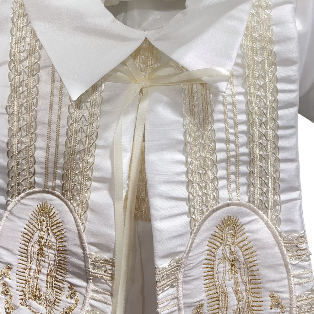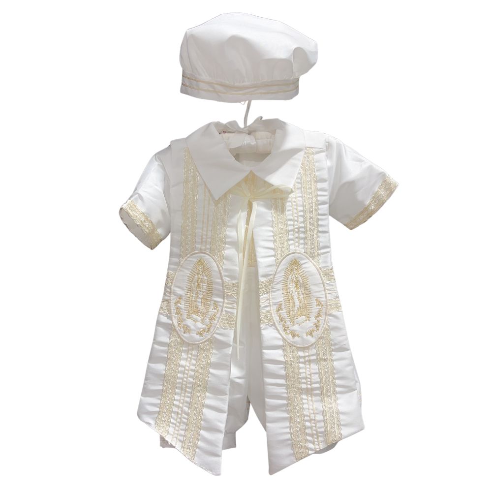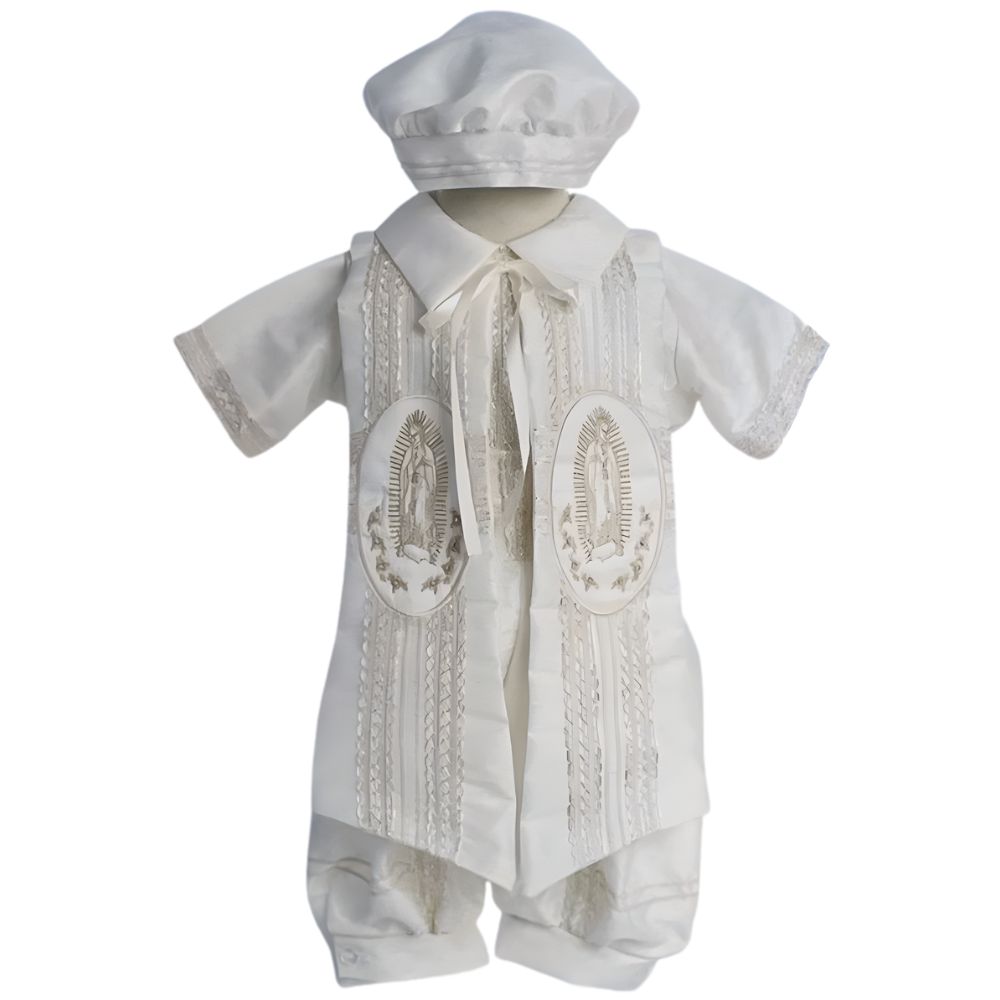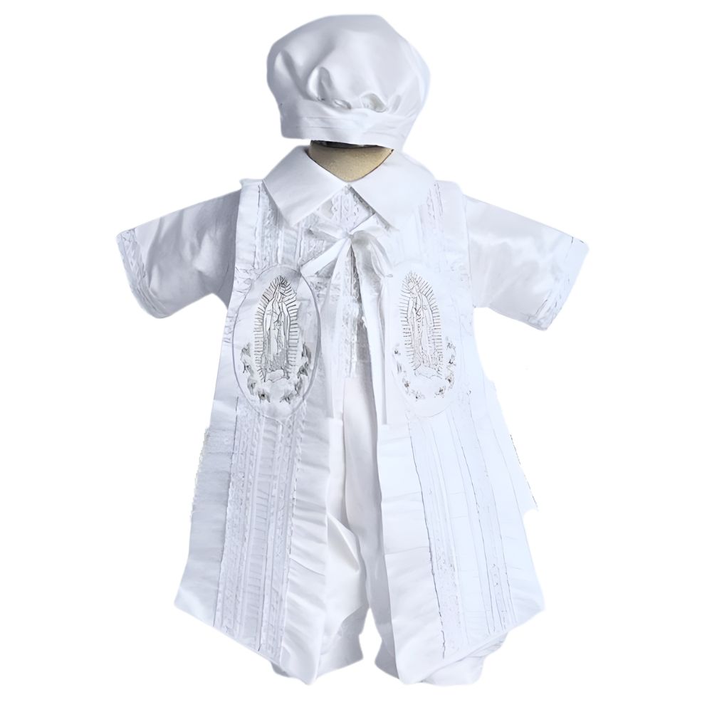 Celebrate your little one's sacred milestone with this exquisite boy's baptism and christening romper, lovingly crafted to convey grace and purity. Made from silky soft satin and adorned with intricate lace accents, this heirloom piece includes a removable shawl delicately embroidered with the image of Our Lady of Guadalupe. A matching bonnet completes the ensemble, adding a touch of traditional charm. Designed for comfort and elegance, this angelic outfit wraps your baby in warmth, faith, and timeless beauty, creating treasured memories for generations.